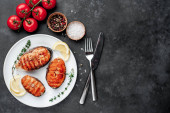 grillowany stek łososiowy ze składnikami nad nożem mięsnym na kamiennym tle