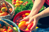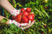 Zdjęcie "Kobieta farmerka w czerwonym fartuchu, rękawiczki z koszykiem pełnym świeżych surowych warzyw. Kosz z rzodkiewkami, zieleniną, ogórkiem, pomidorami nad polem w rękach samic. Zbiory warzyw z wiejskiego ogrodu." może być wykorzystywane do celów osobistych i komercyjnych zgodnie z warunkami zakupionej licencji Royalty-free. Obraz jest dostępny do pobrania w jakości wysokiej rozdzielczości do 5760x3840.