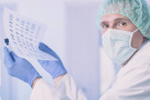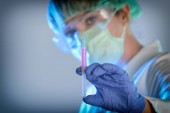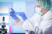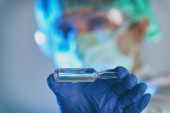 naukowiec pracujący w laboratorium trzymającym ampułkę z nowym lekiem przeciwwirusowym