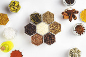 Ziołowe i mineralne organiczne suplementy diety w kapsułkach. Składniki w suplementach diety w talerzach