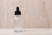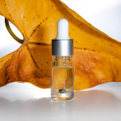 Butelka bursztynowa z kroplomierzem na żółtym tle. Przestrzeń kopiowania