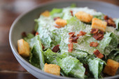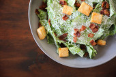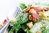 Zbliżenie zdrowej sałatki cesarskiej z grzankami i szynką w plasterkach.
