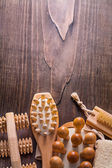 Ręcznie robione drewniane naczynia kuchenne i nóż, widok z góry wiele kęsów, łyżki i talerze na drewnianym stole, selektywne ustawianie ostrości