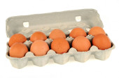 Wiklinowy koszyk świeżych organicznych jaj kurzych z bliska na białym tle