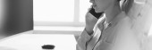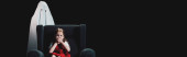 Ojciec w mundurze wojskowym obejmujący córkę, siedząc na kolanach przy tylnych drzwiach z rozmazaną kobietą na pierwszym planie, sztandar, monochromatyczny