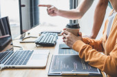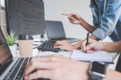 Zdjęcie "Dwóch profesjonalnych programistów współpracujących i pracujących nad projektem strony internetowej w oprogramowaniu rozwijającym się na komputerze stacjonarnym w firmie, kody i wpisywanie kodu danych, Programowanie z HTML, PHP i javascript." może być wykorzystywane do celów osobistych i komercyjnych zgodnie z warunkami zakupionej licencji Royalty-free. Obraz jest dostępny do pobrania w jakości wysokiej rozdzielczości do 5760x3840.