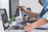 Zdjęcie "Programiści współpracujący przy tworzeniu oprogramowania programistycznego i serwisu internetowego opracowują firmowe biuro, zapisują kody i wpisują kod danych, programują HTML, PHP i javascript." może być wykorzystywane do celów osobistych i komercyjnych zgodnie z warunkami zakupionej licencji Royalty-free. Obraz jest dostępny do pobrania w jakości wysokiej rozdzielczości do 5760x3840.