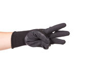 Ręka na czarną rękawicę i gąbkę. Ręka z czarną rękawicą. Koncepcja pracy w gospodarstwie domowym