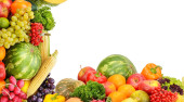 Kolekcja panoramiczna świeże owoce i warzywa izolowane na białym tle. Kolaż. Szerokie zdjęcie. Wolne miejsce na tekst.