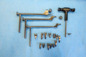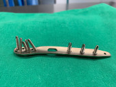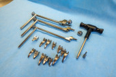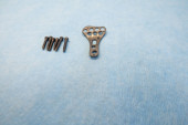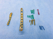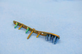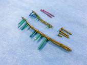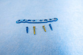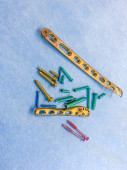 wyjaśnione śruby tytanowe i płyty tytanowe w różnych kolorach i rozmiarach leżą na niebieskiej tkaninie