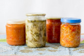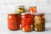 3 szklane słoiki marynowanych warzyw, domowej roboty dla unikalnego przepisu. Czosnek. pomidory, papryka, marchew i inne.
