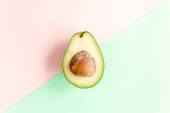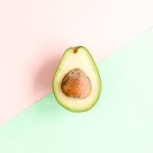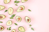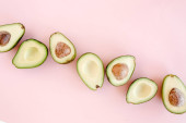 Awokado na różowym tle. Tropikalne abstrakcyjne tło z awokado. Koncepcja jedzenia. układanie płaskie, widok z góry