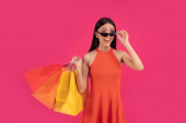 Piękna młoda kobieta z papierowymi torbami na żółtym tle