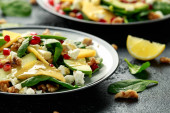 Smaczna sałatka z plastrami gruszki i nasionami granatu na stole, zbliżenie