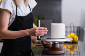 Świąteczne jedzenie. Szef kuchni gotuje deser w kuchni wylewając na niego proszek kakaowy