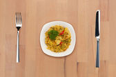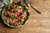 Zdrowa sałatka wegetariańska z gryką i warzywami na białym talerzu na drewnianym tle, widok z góry z przestrzenią do kopiowania