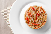 Zdjęcie "Sałatka warzywna z ciepłą gryką, pomidorami, papryką, cebulą, oliwą z oliwek i różnymi ziołami na białym talerzu na drewnianym tle, widok z góry z przestrzenią do kopiowania" może być wykorzystywane do celów osobistych i komercyjnych zgodnie z warunkami zakupionej licencji Royalty-free. Obraz jest dostępny do pobrania w jakości wysokiej rozdzielczości do 5760x3840.