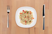 Sałatka warzywna z ciepłą gryką, pomidorami, papryką, cebulą, oliwą z oliwek i różnymi ziołami na białym talerzu na drewnianym tle, widok z góry z przestrzenią do kopiowania