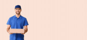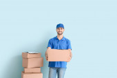 Dostawca z bukietem kwiatów i pustą wizytówką na białym tle
