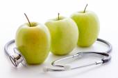 Zielone jabłko i stetoskop na białym tle. Koncepcja diety i odchudzania