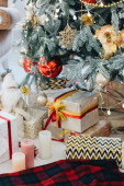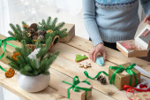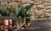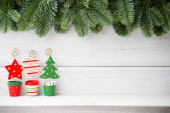 Przygotowuję się do świąt. Świąteczne tło. Pierniki ciasteczka w glazury leżą na teksturowanym drewnianym stole w narożnikach tła. Przestrzeń kopiowania
