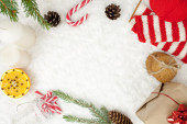przygotowanie do świąt. Świąteczne tło. Kobieta kładzie mrożony piernik na teksturowanym drewnianym stole z pudełkami z prezentami związanymi wstążkami. Przestrzeń kopiowania