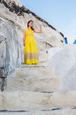 Stylowa czerwona sukienka moda i zielona kurtka kompozycja portret młodej kobiety brunet na zewnątrz. poważny, skoncentrowany, marzycielski wygląd z boku, oddolny wygląd. Czerwona ściana w tle. Bystre emocje.