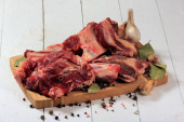 Surowe mięso z kością na glinianej płycie i brązowym tle kamiennym.Surowe mięso z kością wołową. Wybór kości wołowych do zupy