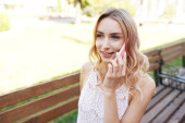 młoda stylowa piękna kobieta w niebieskiej sukience z nadrukiem, okulary przeciwsłoneczne, szczęśliwy nastrój, modny strój, modna odzież, uśmiech, lato, akcesoria