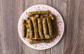 Zdjęcie "Tradycyjny wypchany squash i kapusta bułki na białym talerzu na ciemnym drewnianym tle z miejsca do kopiowania. Słynna tradycyjna kuchnia Bliskiego Wschodu, egipska, azjatycka. Mahshi lub mahshy, nadziewane warzywa" może być wykorzystywane do celów osobistych i komercyjnych zgodnie z warunkami zakupionej licencji Royalty-free. Obraz jest dostępny do pobrania w jakości wysokiej rozdzielczości do 5760x3840.