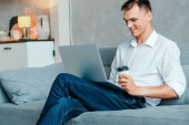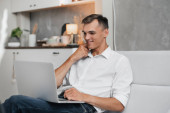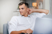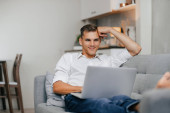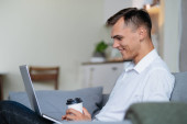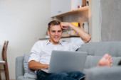 uśmiechnięty młodzieniec patrzący na ekran swojego laptopa .