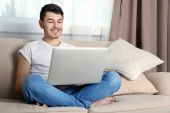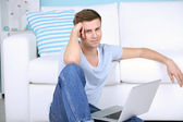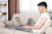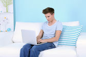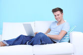 facet leżeć na kanapie z laptopem na niebieskim tle