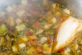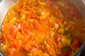 Zbliżenie indyjskiego dania warzywnego sabzi z sosem pomidorowym