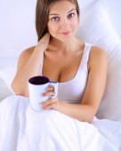 kobieta w białych nightie, leżąc w łóżku obok filiżankę kawy