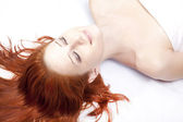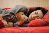 kobiety w biały nightie, leżąc w łóżku z zabawki miękkie.