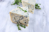 smaczny ser pleśniowy z pomidorami, bazylią i przyprawy na drewnianym stole