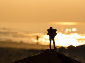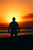 sylwetka człowieka na plaży, w tle niebo zachód słońca