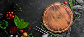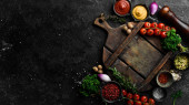 Białe tło kulinarne z przyprawami, ziołami i naczyniami kuchennymi. Widok góry. styl rustykalny.