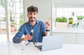 Zdjęcie "Człowiek pracujący jako gospodarz radiowy w stacji radiowej, siedzący przed mikrofonem. Młody gospodarz radiowy moderujący program na żywo dla radia z maską na twarzy. Pracuję w domu. Koronawirus." może być wykorzystywane do celów osobistych i komercyjnych zgodnie z warunkami zakupionej licencji Royalty-free. Obraz jest dostępny do pobrania w jakości wysokiej rozdzielczości do 5760x3840.