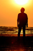 sylwetka człowieka na plaży, w tle niebo zachód słońca