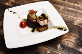 Danie z nowoczesną prezentacją na kwadratowej płycie. Posiłek francuski