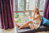 brunetka kobieta w białym szlafroku siedzi na balkonie i czytać magazyn