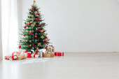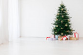Choinka sosna z prezentami na nowy rok interr pocztówka biały szary tło wystrój