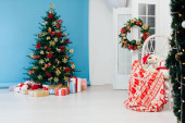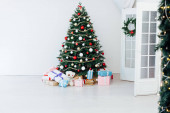 Choinka sosna z prezentami na nowy rok wnętrze pocztówka baner biały niebieski tło