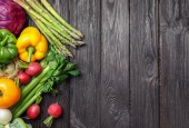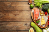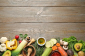 Płaska kompozycja świeckich ze składnikami do gotowania na drewnianym stole. Miejsce na tekst