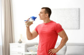 Człowiek pijący czystą wodę ze szkła w kuchni. Miejsce na tekst