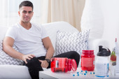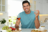 Mężczyzna trzyma szklankę czystej wody przy stole w kuchni