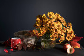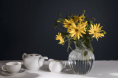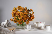 Bukiet pomarańczowego helenium z dzikimi liśćmi winogron w szklanym wazonie o ciemnoniebieską ścianę. Biały czajnik, filiżanka i spodek i dzbanek mleka do picia herbaty.
