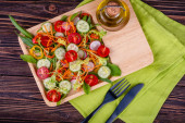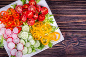 Świeże posiekane warzywa na talerzu na drewnianym stole.
