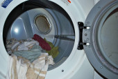 Ładunek mokrych ręczników idzie do suszarki w dzień prania